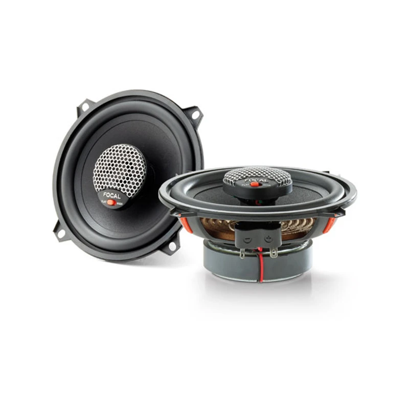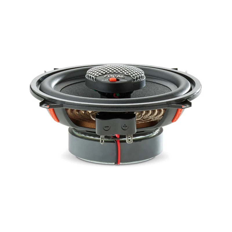 En este modelo coaxial, el tweeter de aluminio y magnesio está equipado de un regulador de nivel con dos posiciones Flat/High (+3 dB) para aumentar los agudos. Este regulador resulta muy útil, particularmente si el altavoz se encuentra debajo de la puerta.