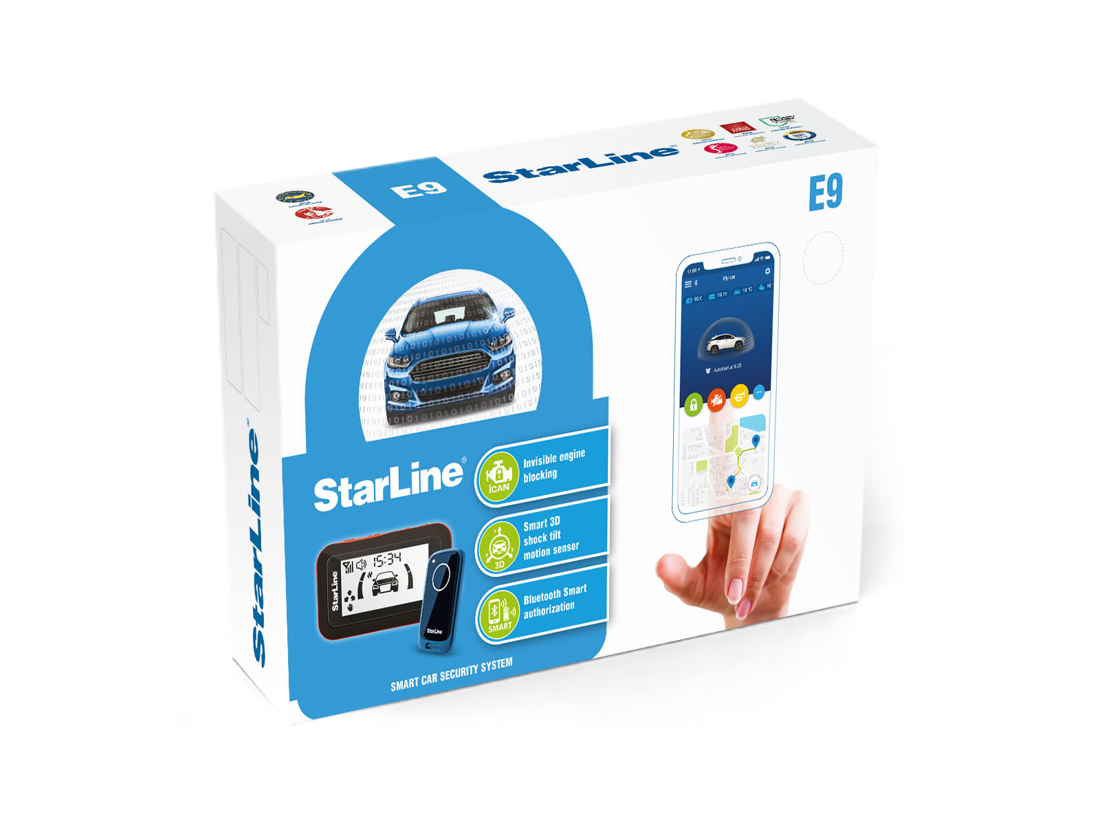 La serie E9 incluye encriptación AES-128 Bit para una seguridad robusta en sus comunicaciones, SuperSlave, Pin-to-Drive, bloqueo de motor iCAN, bypass sin llave iKey, Secure Keyless-Go, sensor de inclinación 3D interno, sensor de temperatura, zumbador integrado, control Webasto/ Eberspacher, manos libres y lectura del inmovilizador del vehículo para arranque remoto iKey bypass.